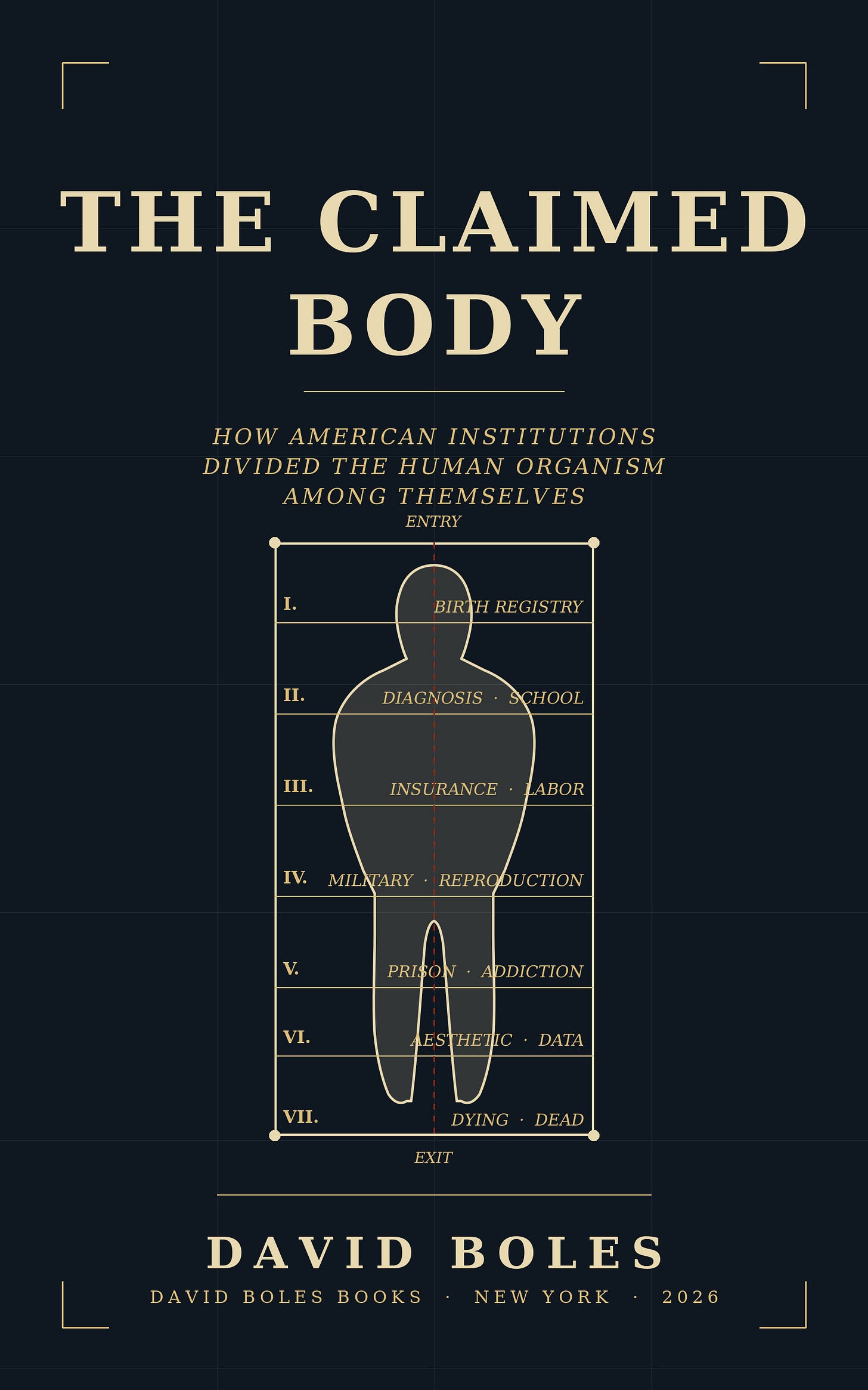 My new book, The Claimed Body: How American Institutions Divided the Human Organism Among Themselves, argues that the Homestead Act’s registered-claim logic did not retire in 1976. It migrated. It now operates on the American body instead of on American land. Institutions file claims on portions of the body the way settlers once filed claims on parcels of ground. A hospital claims your birth. A school claims your developmental measurements. An insurer claims your diagnostic history. An employer claims your labor capacity and your drug screens. The state claims your reproductive eligibility and your military eligibility. At the other end of life, a dying registry claims the moment of your cessation and a funeral corporation claims the disposal of your remains. Every claim has its paperwork, its jurisdiction, its enforcement mechanism, and its procedural history. No single institution claims the body in its entirety. Many institutions claim portions of it, at specific moments, under specific authorities.