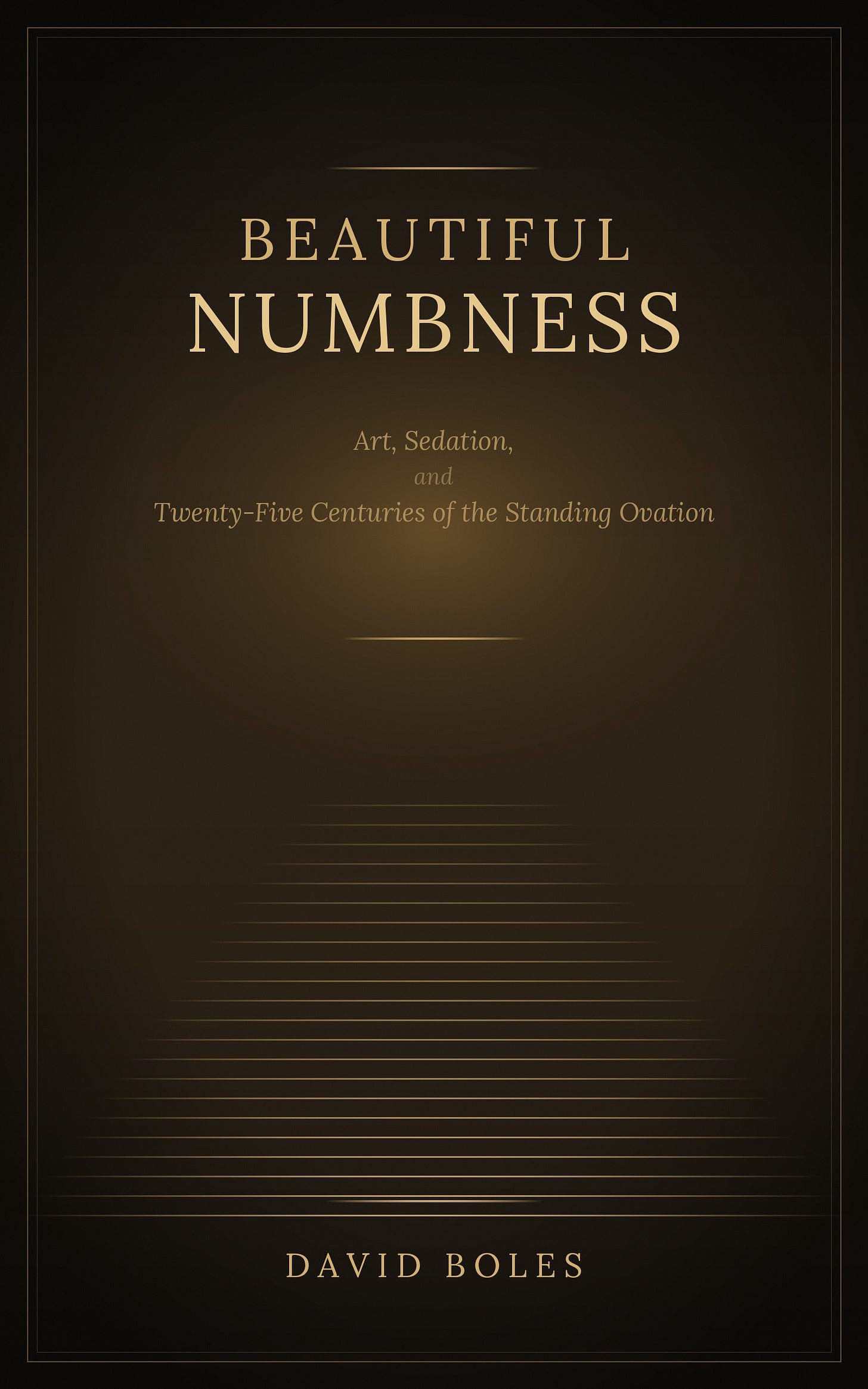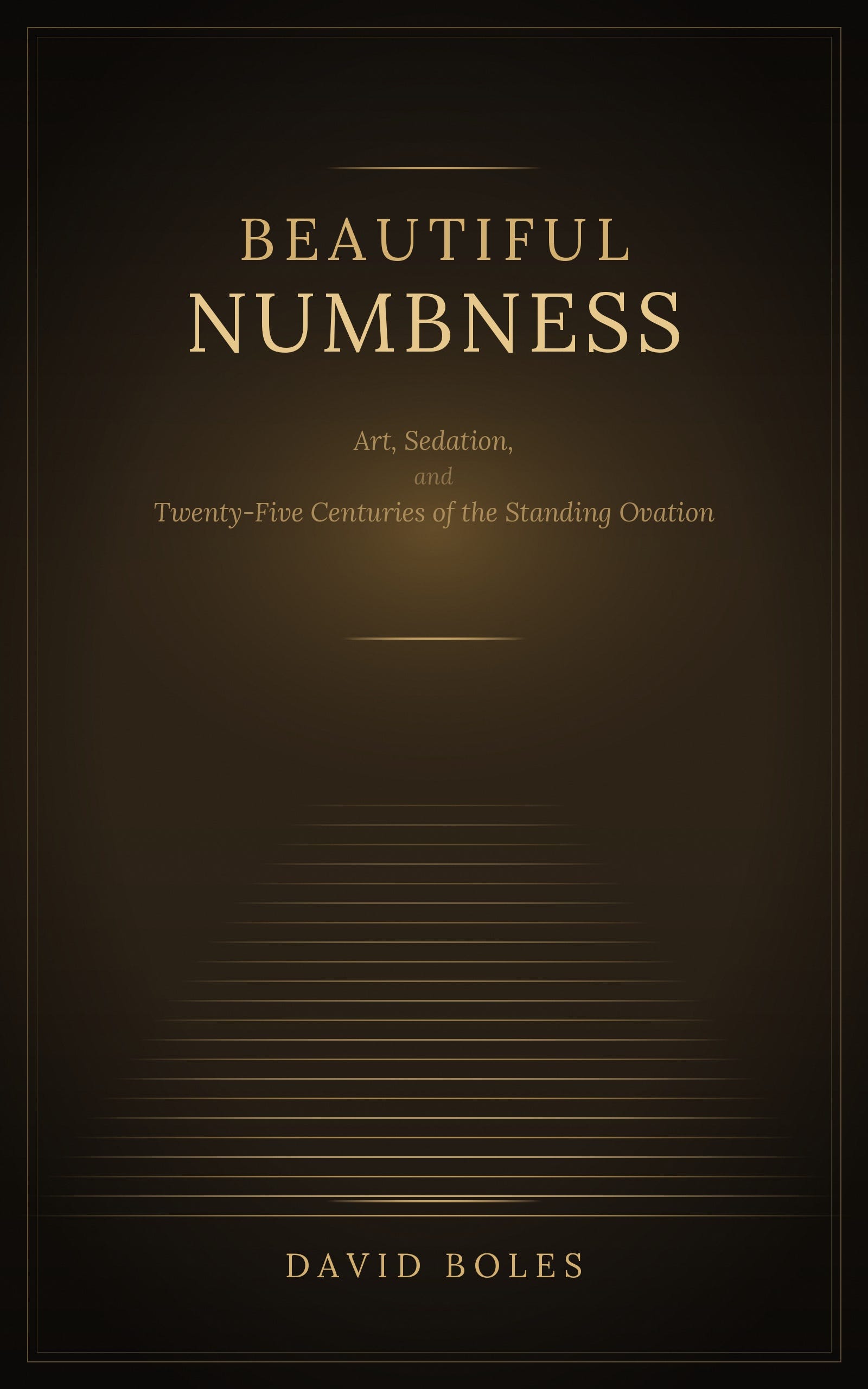 My new book, Beautiful Numbness: Art, Sedation, and Twenty-Five Centuries of the Standing Ovation, traces the economics of this arrangement from the Theatre of Dionysus in fifth-century Athens to the infinite scroll on the phone in your pocket. The argument is specific and evidenced. Institutional art in the Western tradition, art produced and distributed through the apparatus of state, church, patronage, market, and academy, has functioned primarily as a sedative: an analgesic for the pain of consciousness that keeps the patient still while the conditions producing the pain remain untouched. The beauty is real. The catharsis is real. The function is pharmacy.